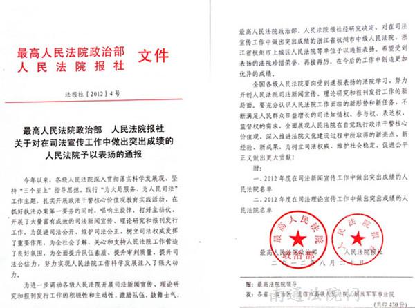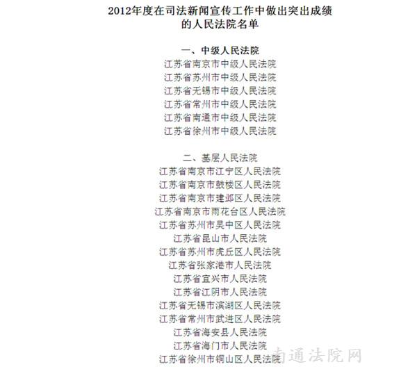 2012年,南通市中级人民法院司法宣传工作受到最高院政治部通报表扬