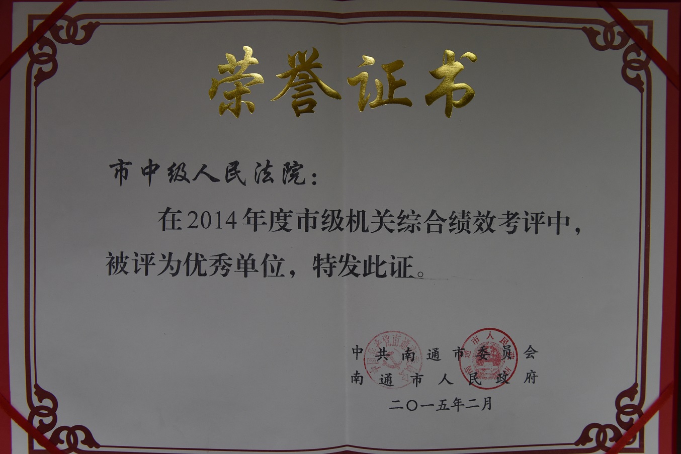 2014年,南通市中级人民法院获评“南通市级机关综合绩效优秀单位”